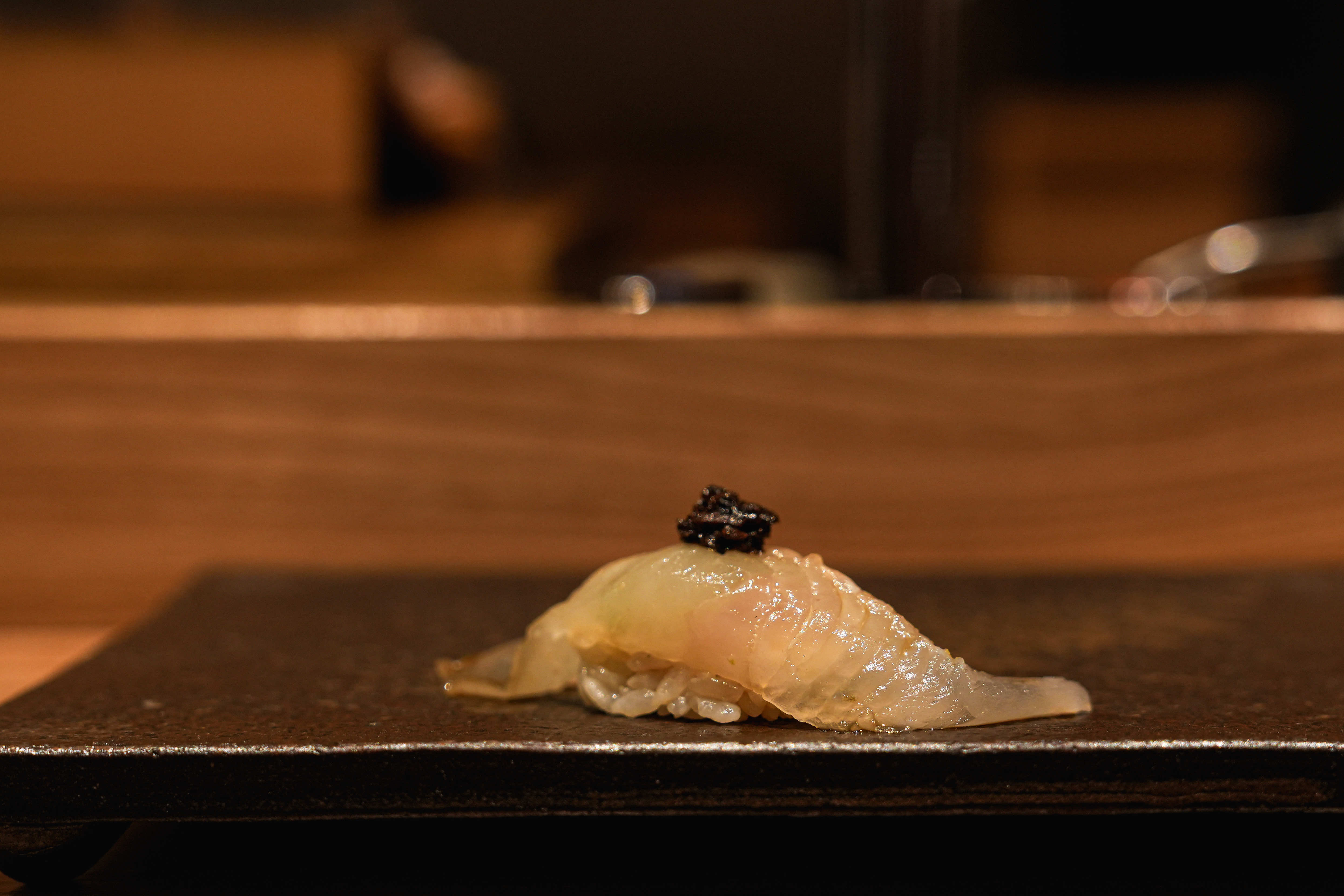 其实第一二道开胃菜吃完我有点生气,坐在吧台前都难以让我控制表情,气鼓鼓地等寿司。吃了第一道炙烤Tuna,心情变好了一点,但依旧感觉没有记忆中好吃;第二道比目鱼有点腥,鱼肉也不算特别美味,我又开始生气;等到第三第四第五道吃下肚,才开始有心情看 Leo师傅捏寿司。