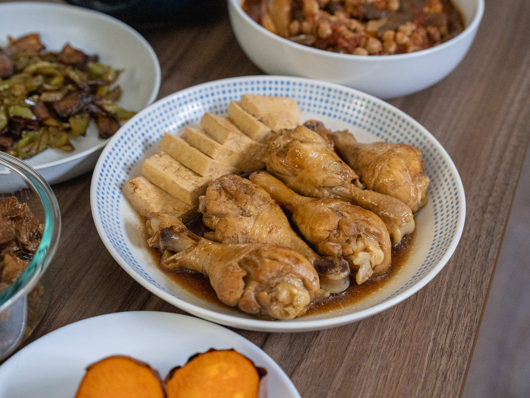 - 鸡腿不似牛肉耐煮,煎过或汆水后小火煮上20-25分钟(内部温度达到160F/74C,戳之无血水流出即可),离火后浸泡在凉的卤汁里过夜。既可以让鸡腿入味又可以避免鸡肉煮老。