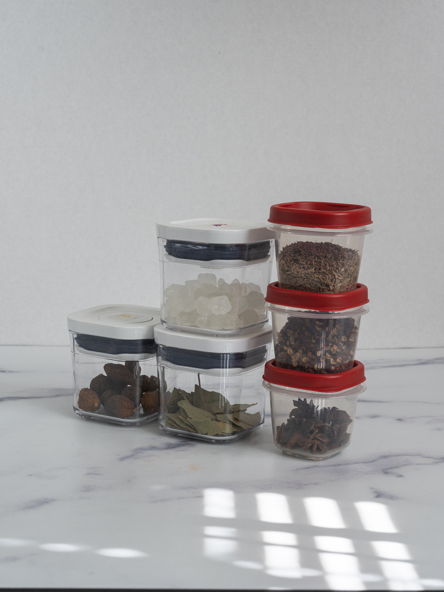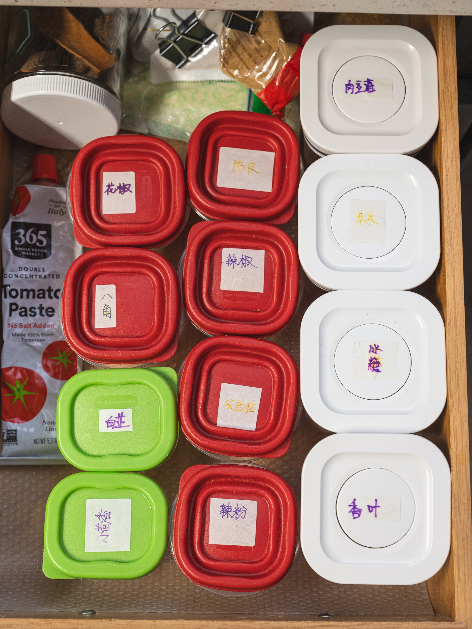 另外一些颗粒比较小的香料,比如孜然粒、茴香、花椒,我会用 rubbermaid 的密封小盒子装,refil一 次可以用上几个月。rubbermaid 的优点是体积小,缺点是开盖不如pop容易。
