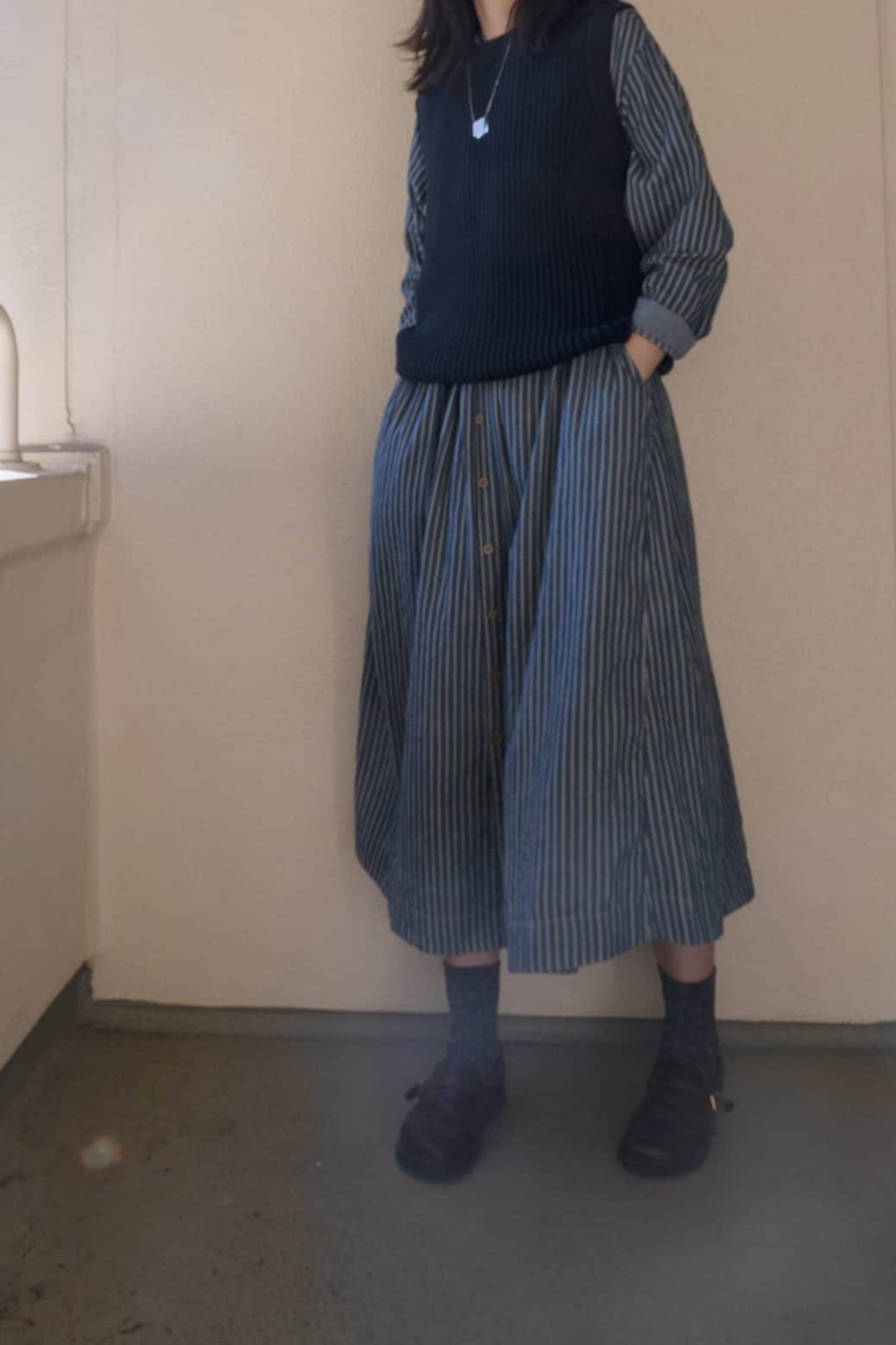 后面两件都是45R去年秋冬的新品,又是逛实体店引发的消费。这两件补足了我一直在寻找的衣柜空缺。第一件是棉布材质的连衣裙,宽松舒适,还是我最爱的条纹图案和低饱和度蓝色系,天热单穿,天冷可叠穿;另一件是羊毛马甲,可以套在打底衫或衬衫外面保暖。这两件买了之后短短四个月都穿了很多次,也和我现有的衣物搭配得很好,属于去年非常满意的消费。CPW偏高只是因为只穿了最后一个季度以及入手价高,我不是很在意。